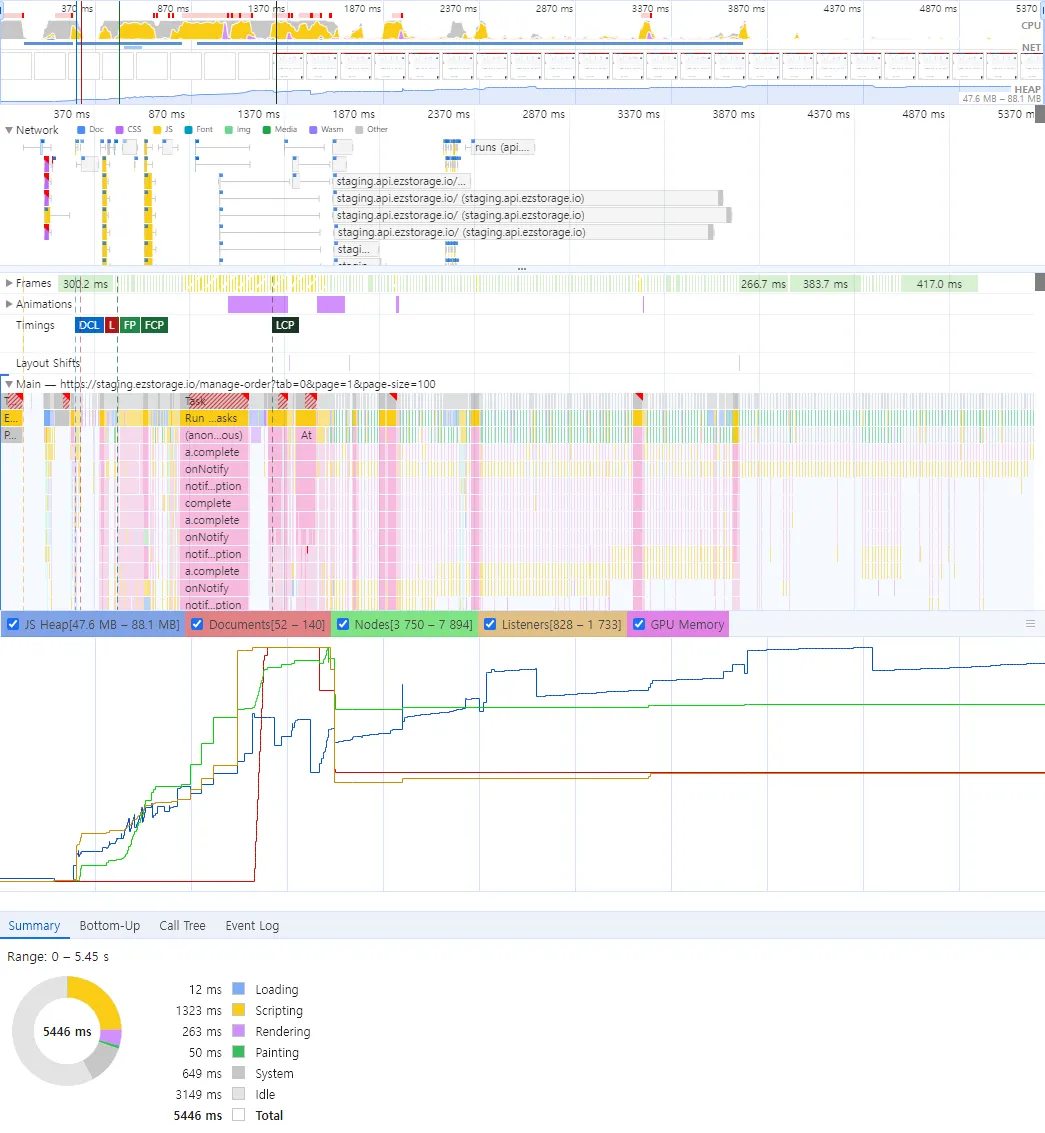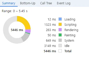 사용자 인터랙션(클릭, 스크롤)과 관련된 작업을 확인하여 병목을 찾아냅니다.