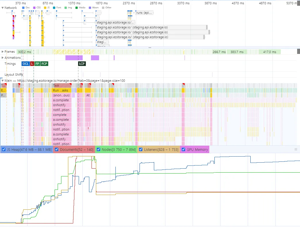 자바스크립트 실행, 레이아웃, 페인팅 등의 작업이 표시됩니다.