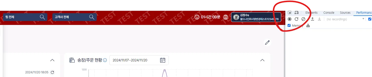 녹화 버튼(●)을 클릭하면 현재 페이지의 성능 데이터를 수집합니다.