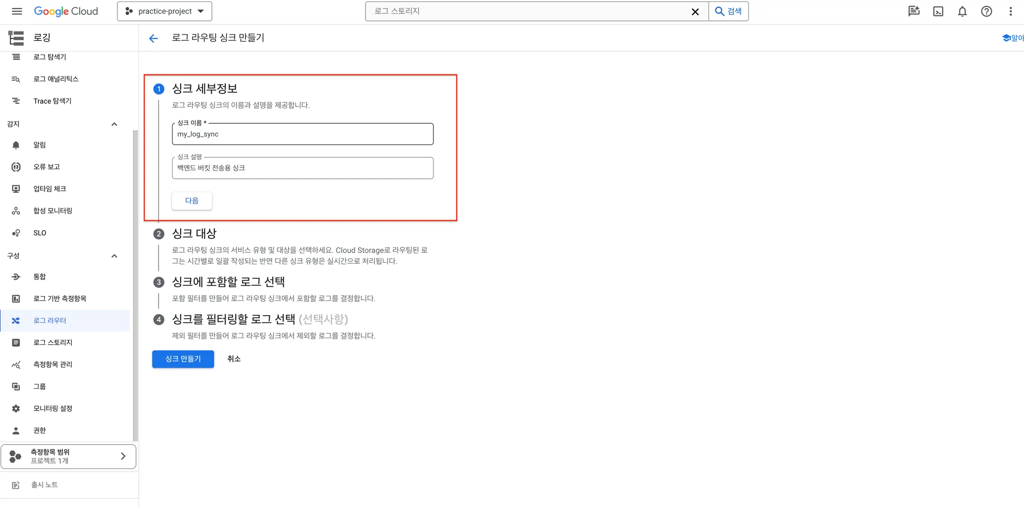 여기까지 작성하고 싱크 만들기 버튼을 눌러 싱크를 생성합니다.