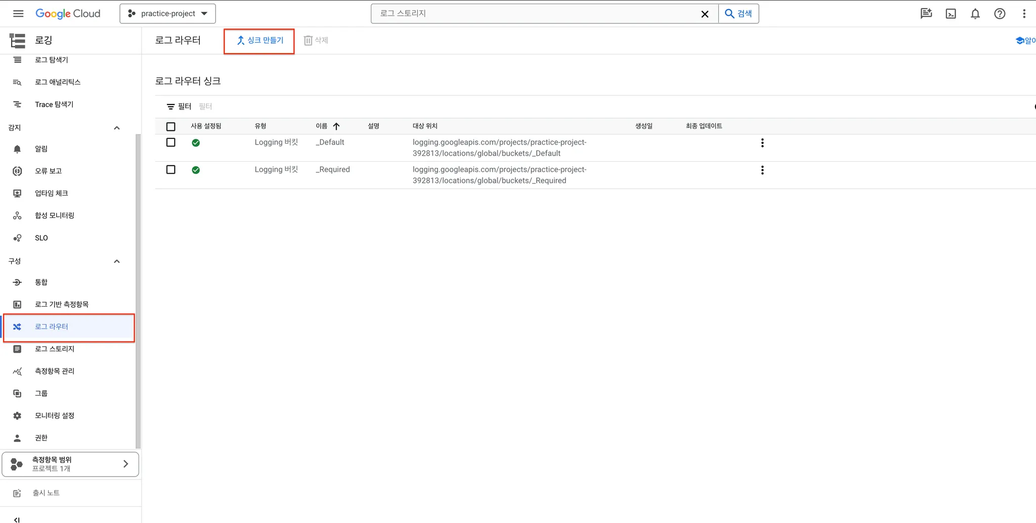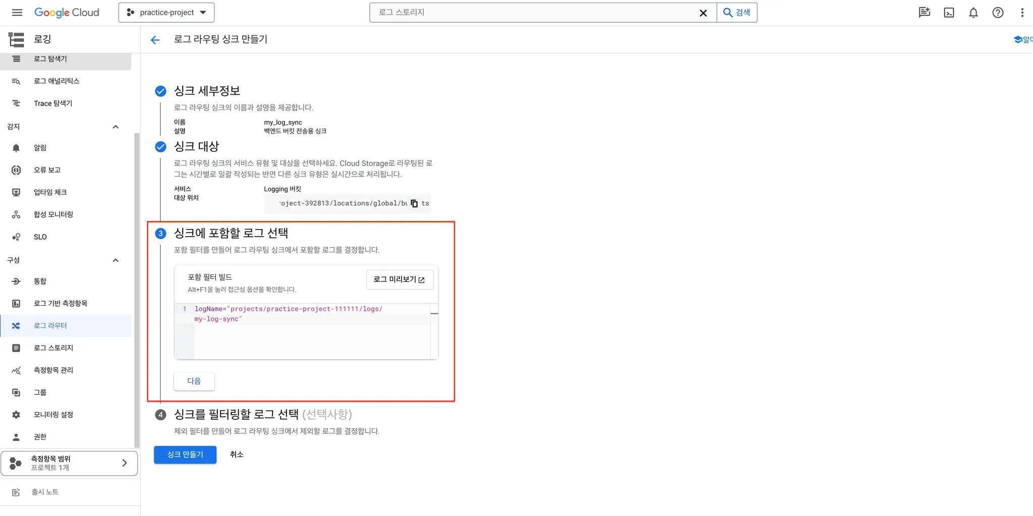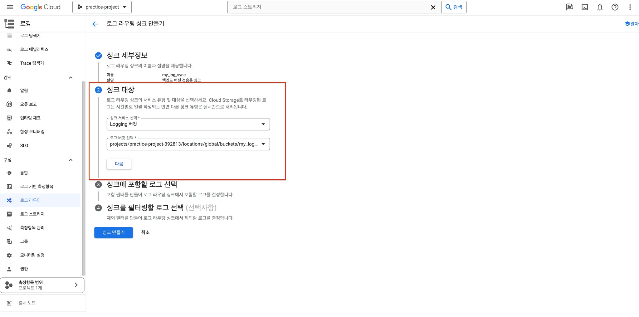 로그 라우터 페이지로 이동해서 싱크 만들기를 클릭하여 싱크 생성 페이지로 이동합니다.