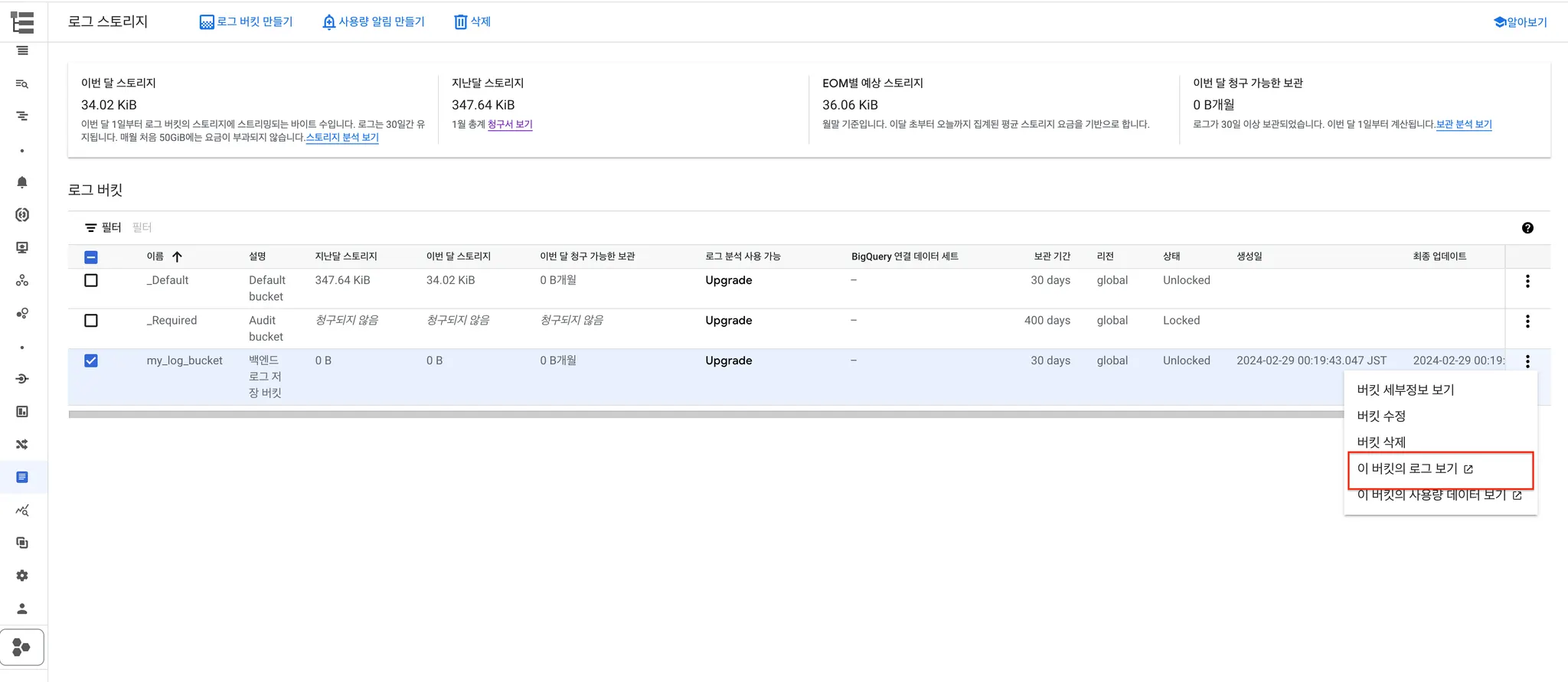 앞서 로그 버킷을 만들었던 로그 스토리지 페이지로 와서 로그를 확인하고자 하는 버킷의 더보기 버튼을 누르고 ‘이 버킷의 로그 보기’를 눌러 로그 탐색기로 이동합니다.