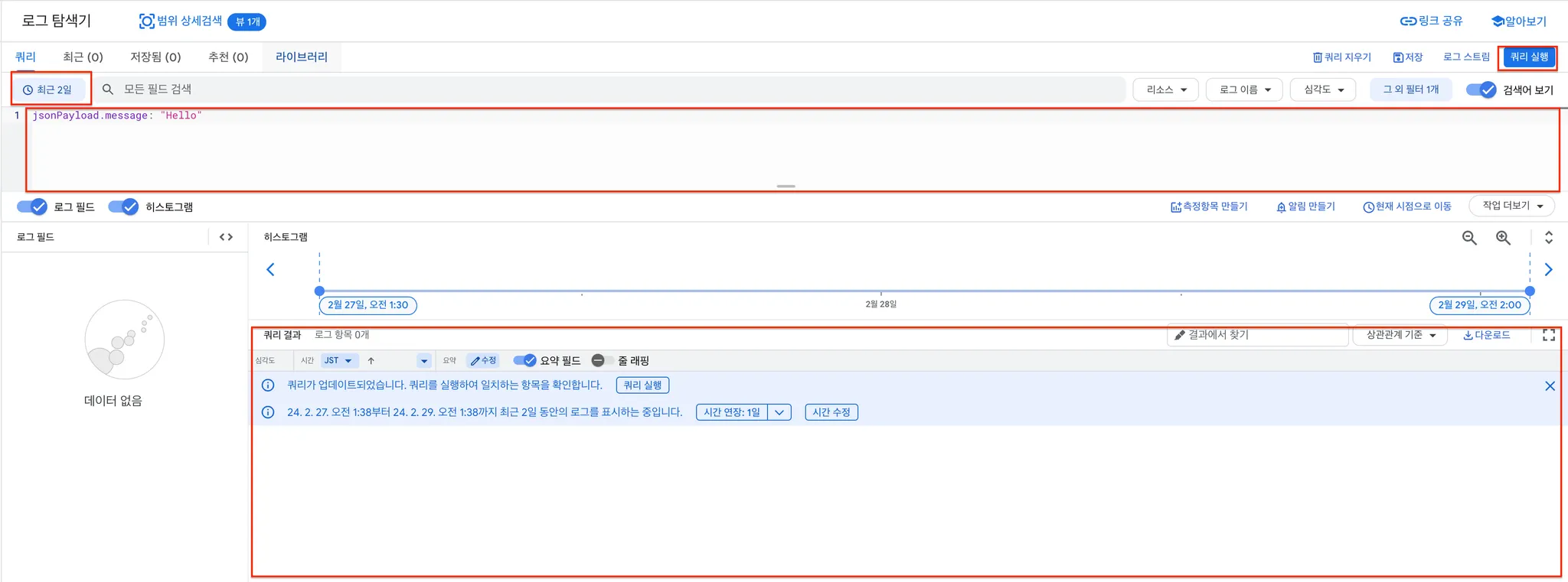쿼리를 작성하고 오른쪽 상단에 쿼리 실행을 누르면 로그 탐색이 시작되고 아래에서 쿼리 결과를 확인할 수 있습니다.