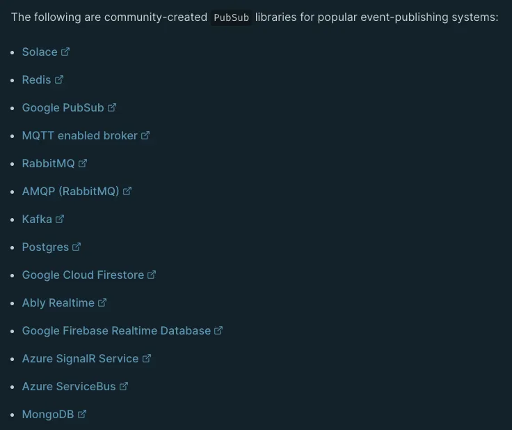 apollo server 공식 문서에는 예제 코드에 아래의 모듈을 사용하고 있지만, 실제 운영 환경에서 사용하는 것을 지양하고 있습니다. 왜냐하면 PubSub 모듈은 in-memory event publish system을 사용하고 있기 때문에 클러스터 모드나 여러 환경에서 서버를 올려 사용하는 경우 이벤트 간에 동기화가 되지 않습니다.