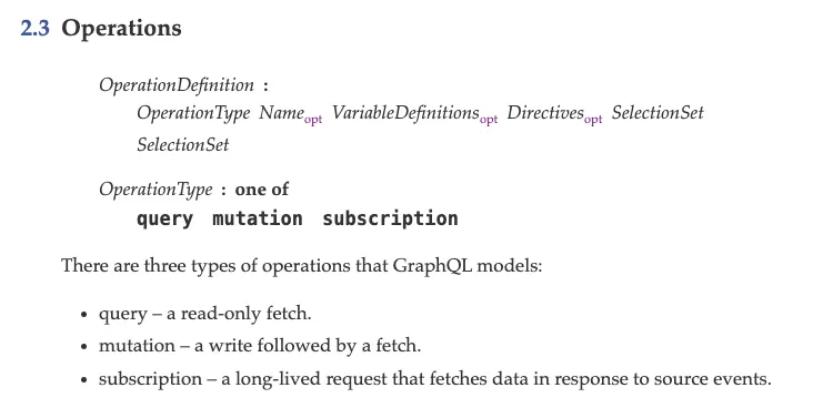 Graphql 스펙에서는 3개의 operations 정의하고 있습니다. 주로 사용하는 query, mutation 이외에 subscription이 존재합니다. 문서에서는 데이터를 가져오는 장기 요청 이라고 설명하고 있습니다.