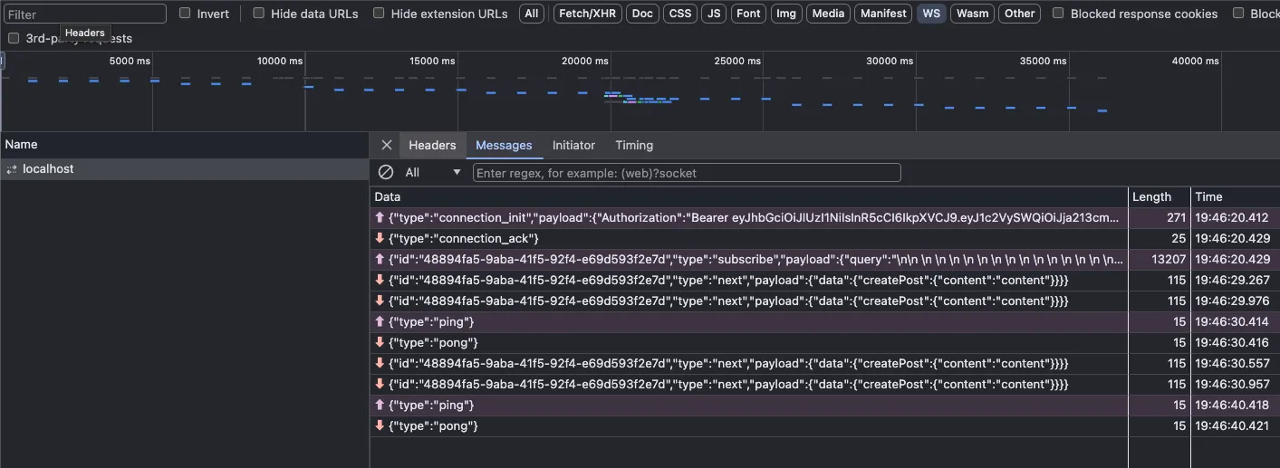 크롬 개발자도구 → Network → WS 부분을 보면, 서버에서 createPost mutation을 호출할 때마다 데이터를 계속 받아오는 것을 확인할 수 있습니다.