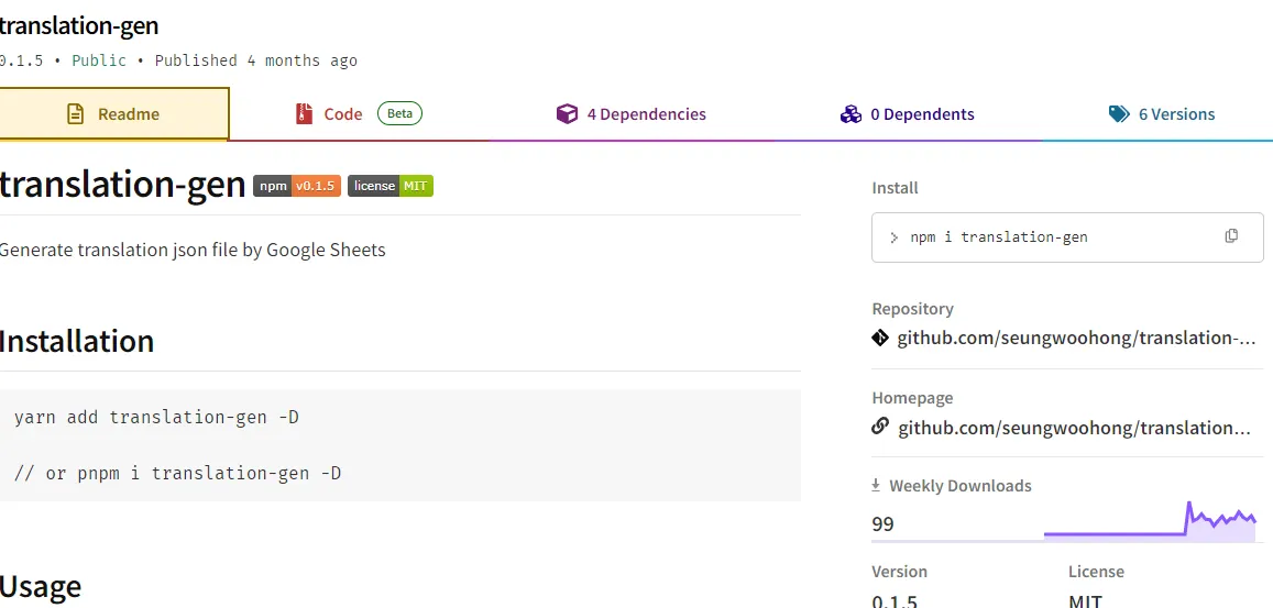 두 번째로 이 스프레드시트를 읽어 JSON 파일을 자동으로 만들어 주는 translation-gen을 만들었습니다.