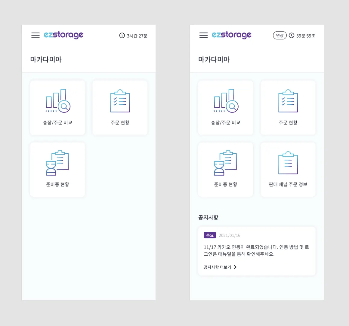 이전 대시보드는 한눈에 보이는 게 아니라 메뉴를 클릭해 이동해야 하는 번거로움이 있어 전체적으로 한눈에 보이길 원한다는 의견이 있었습니다. 왼쪽 AS-IS가 개선 이전, 오른쪽 TO-BE가 개선 이후 시안입니다. 클릭을 해야만 볼 수 있던 정보를 첫 페이지에서 한눈에 보이게 하고 그중 내가 원하는 메뉴를 클릭하여 넘어가게 바뀌었습니다.