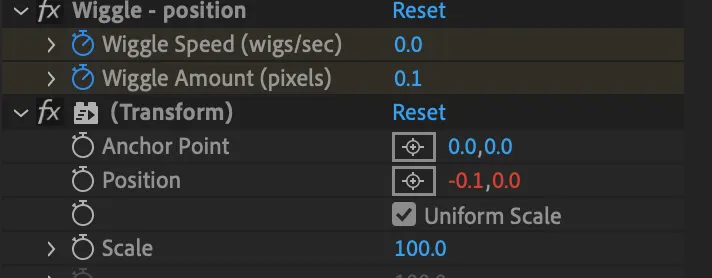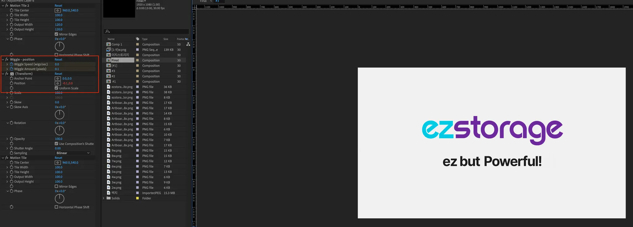 파워풀 텍스트를 강조하려면 1차적으로 텍스트들이 흔들렸다가 쾅! 하는 느낌이 필요해 찾다보니 에펙에서 가장 흔하게? 많이 쓰인다는 Wiggle 효과를 접하게 되었고, 사용해 보니 이미지 전체가 흔들흔들한 효과를 바로 볼 수 있었습니다.