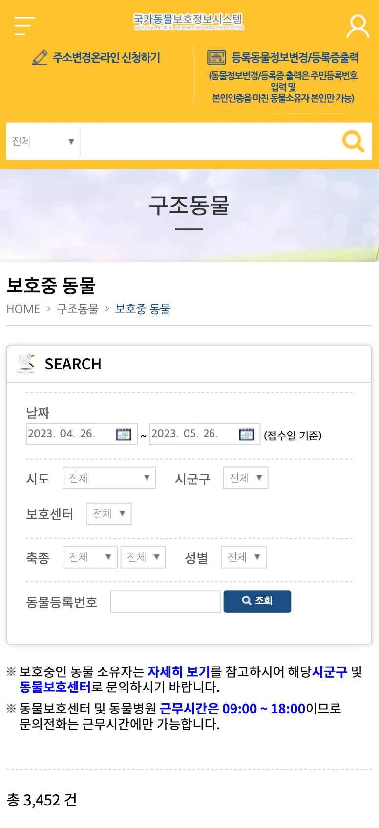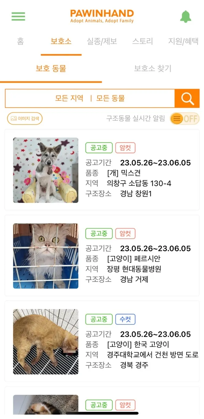 또는 보호소 찾기에서 가까운 보호소의 위치나 연락처, 해당 보호소에서 보호 중인 동물들의 정보를 한 번에 확인할 수 있다.
