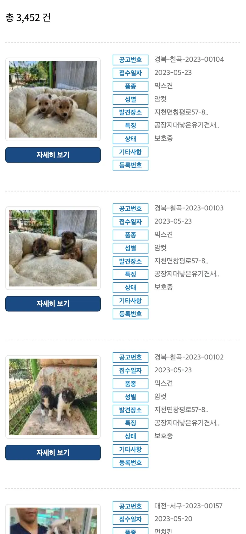 현재는 신규 입소 순서로 정렬되고 있다. 메뉴에 랜딩하면 비교적 공고 기간이 남아있는 아이들을 먼저 보게 되는 셈이다. 하단에 있고 뒤 페이지에 있을수록 보호된 동물들에 접근성이 떨어지는데, 그 아이들은 곧 공고 종료 기간이 다가오는 아이들이다.