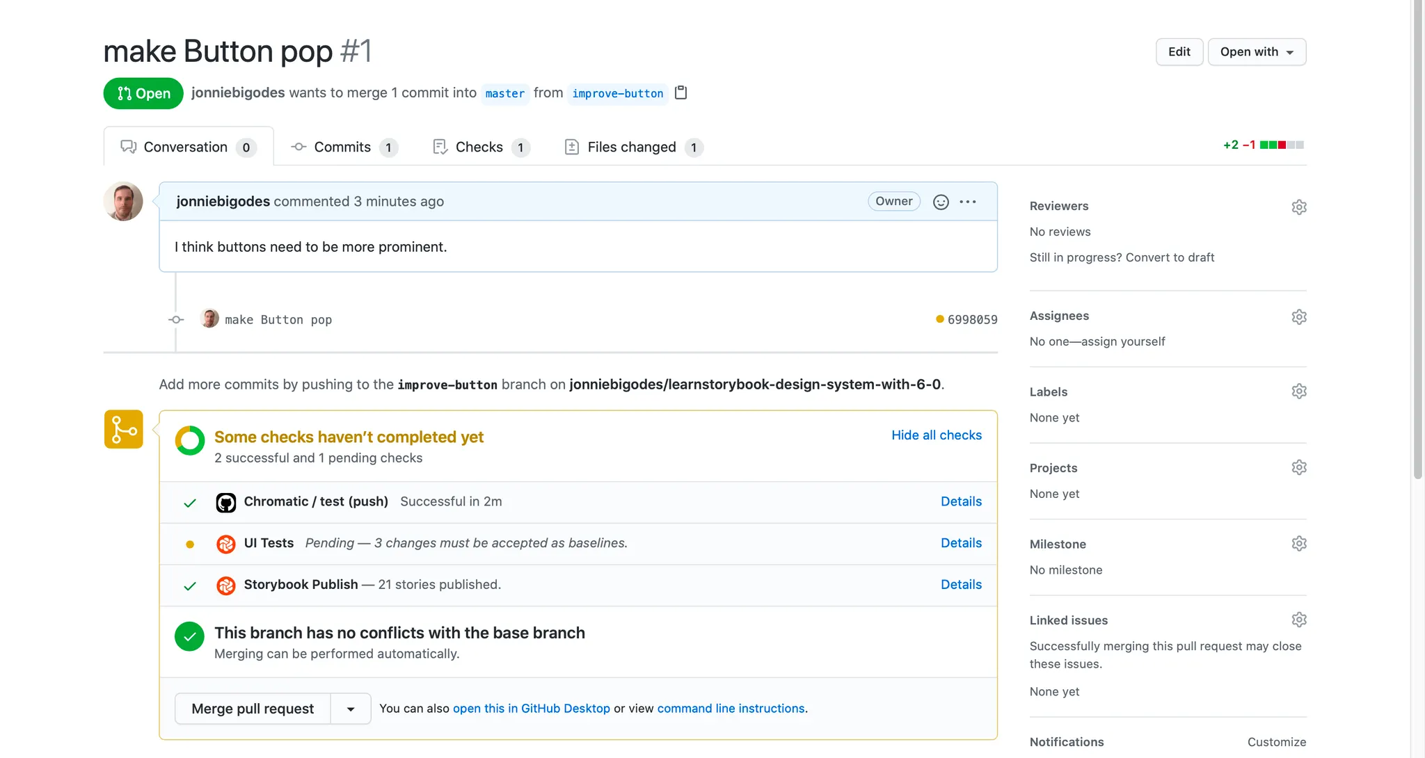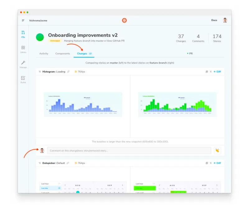 Github에서 diff를 통해 변경된 부분만 편하게 확인할 수 있는 것처럼, Chromatic에서는 변경된 부분의 갯수와 어떤 부분이 변경되었는지 위 그림처럼 초록색 부분으로 강조해줘서 시각적으로 확인할 수 있습니다. 리뷰어들은 이 변경된 부분을 보며 편하게 리뷰할 수 있겠죠?