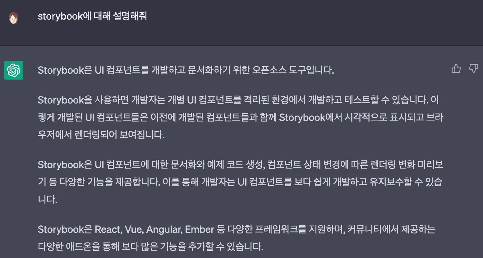 요즘 개발자뿐만 아니라 많은 사람들이 활용하고 있는 ChatGPT가 말하는 Storybook은 아래와 같습니다.