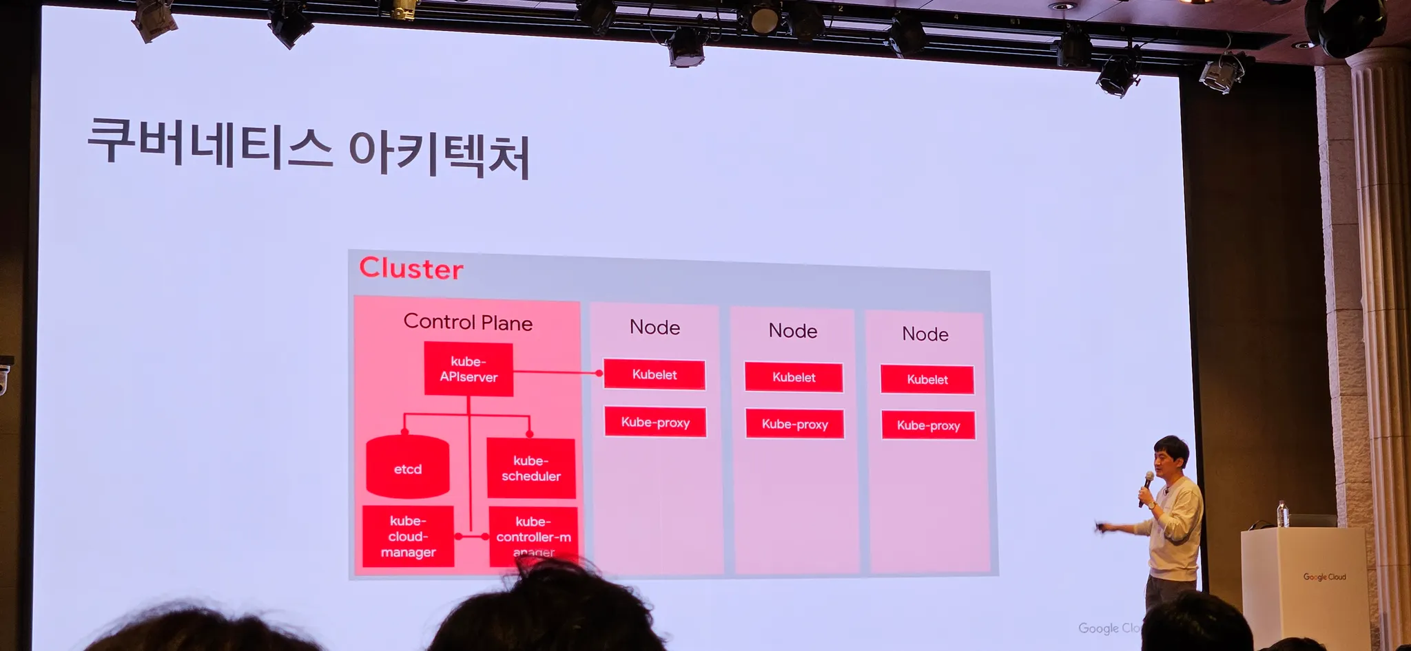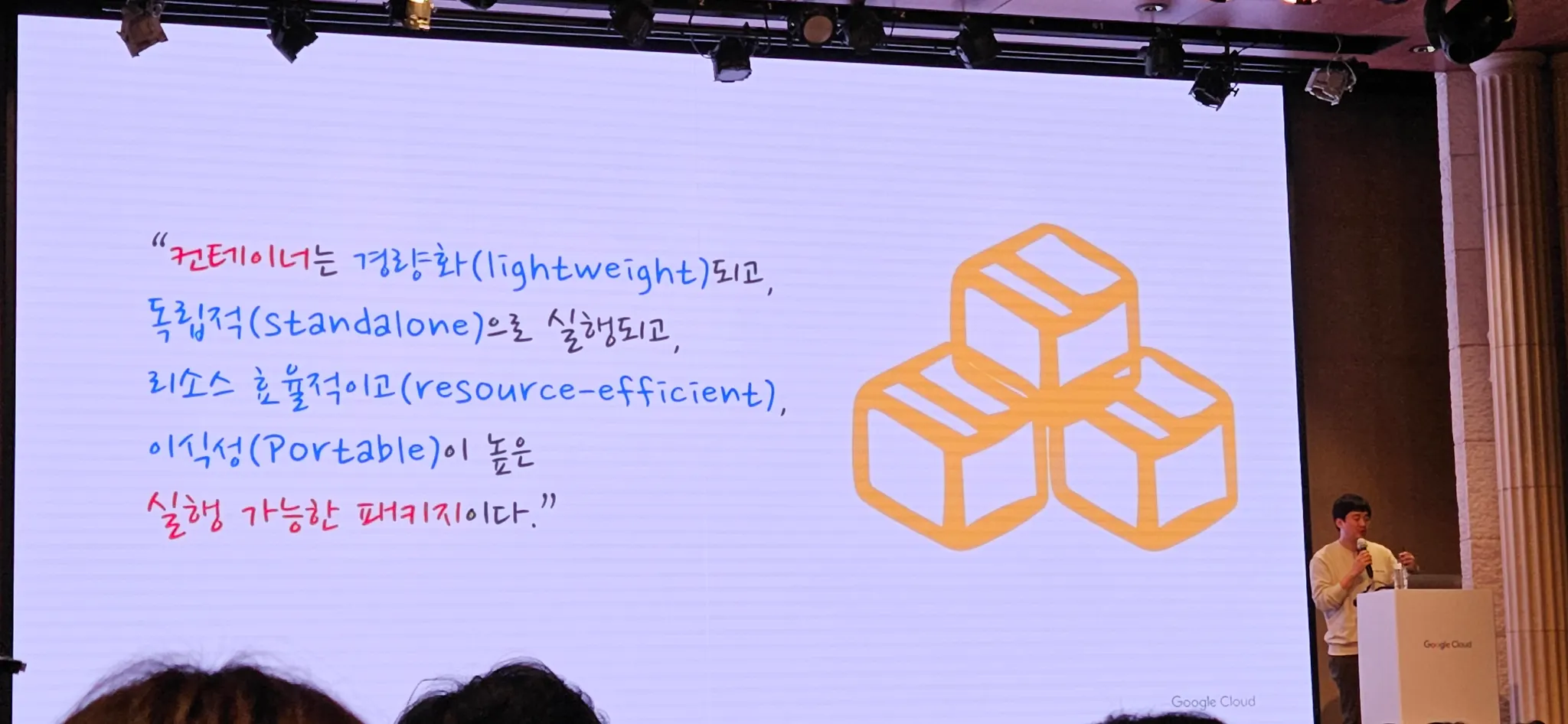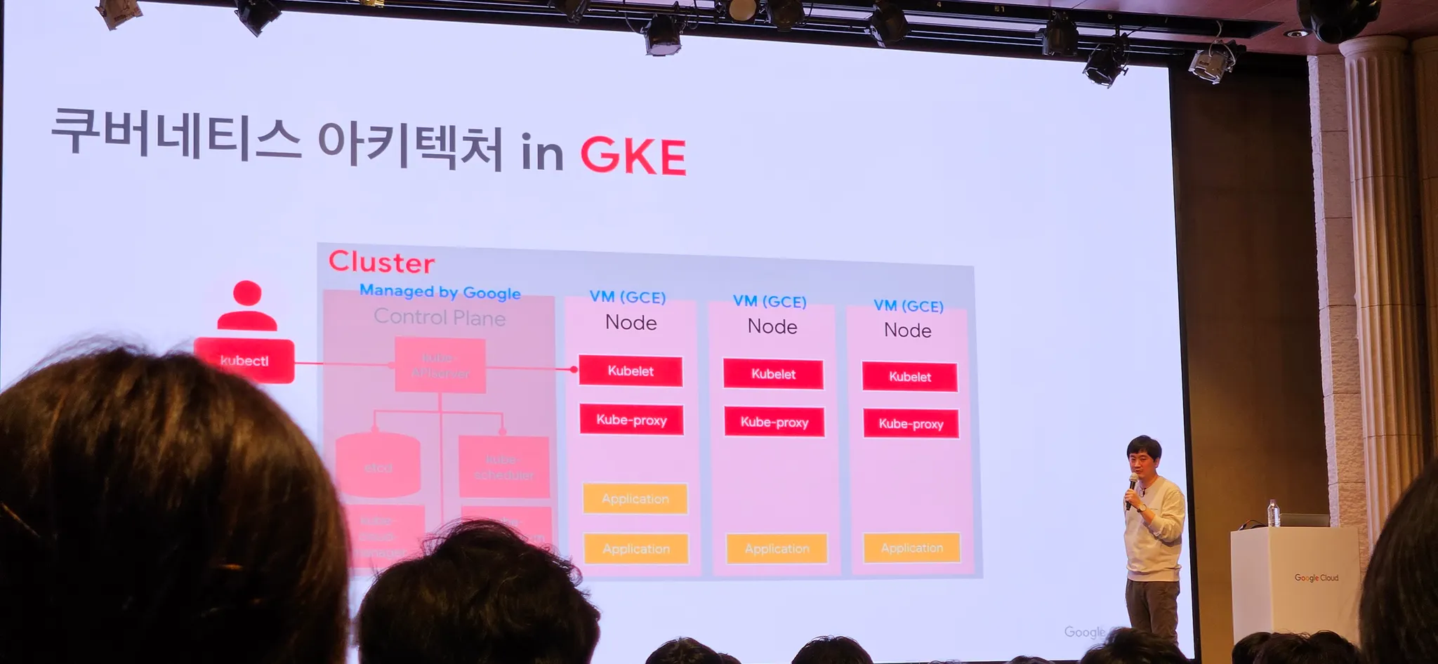 컨테이너를 이용하면 부딪힐 수 있는 문제들에 대해서 설명을 해주시면서 이럴 때 GKE를 사용하게 되면 어떠한 장점이 있는지 알려주시면서 진행을 하셨습니다.