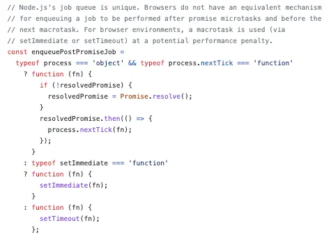 node 환경에서는 process.nextTick()를 사용하지만, 브라우저 환경에서는 setImmediate, setTimeout을 사용합니다.
