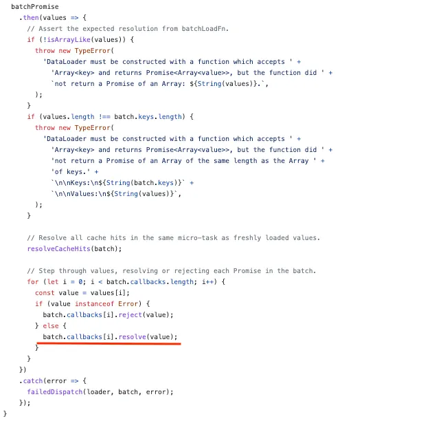 batch.callbacks[]에 authorId를 캐시 하면서 동시에 load메서드에서 반환하는 Promise의 resolve를 같이 캐시했습니다. batch.callbacks[i].resolve(value)를 하나씩 보면…