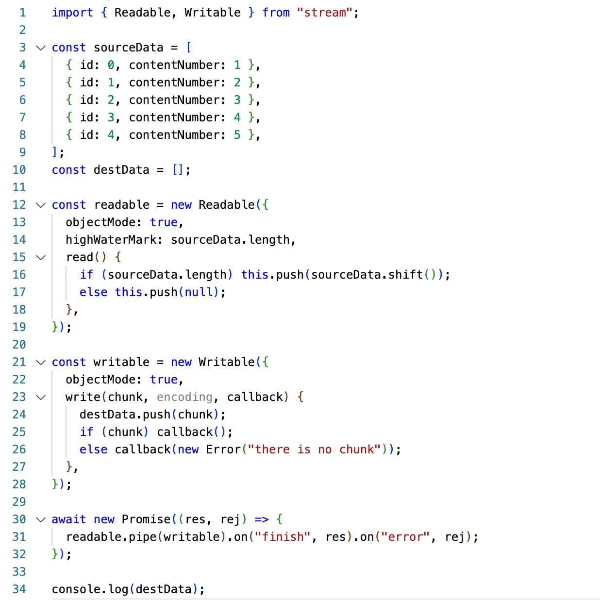 writable은 readable이 뿌려주는 데이터를 받아서 특정한 곳에 다시 적재하는 역할이라고 보시면 됩니다.