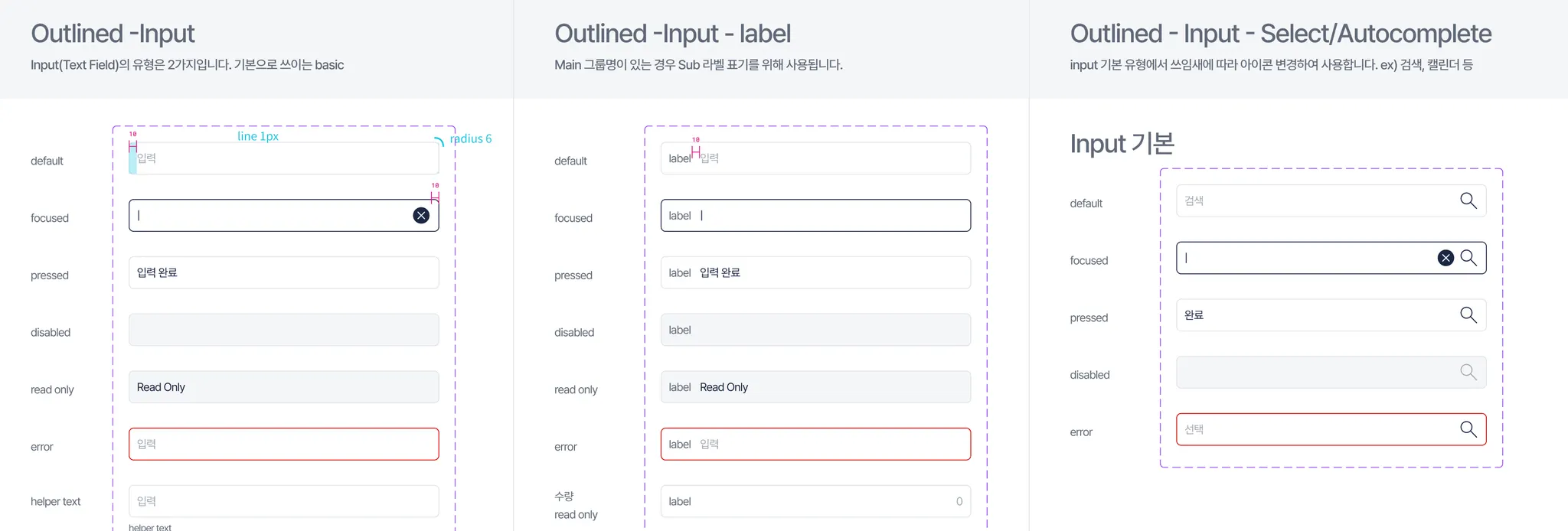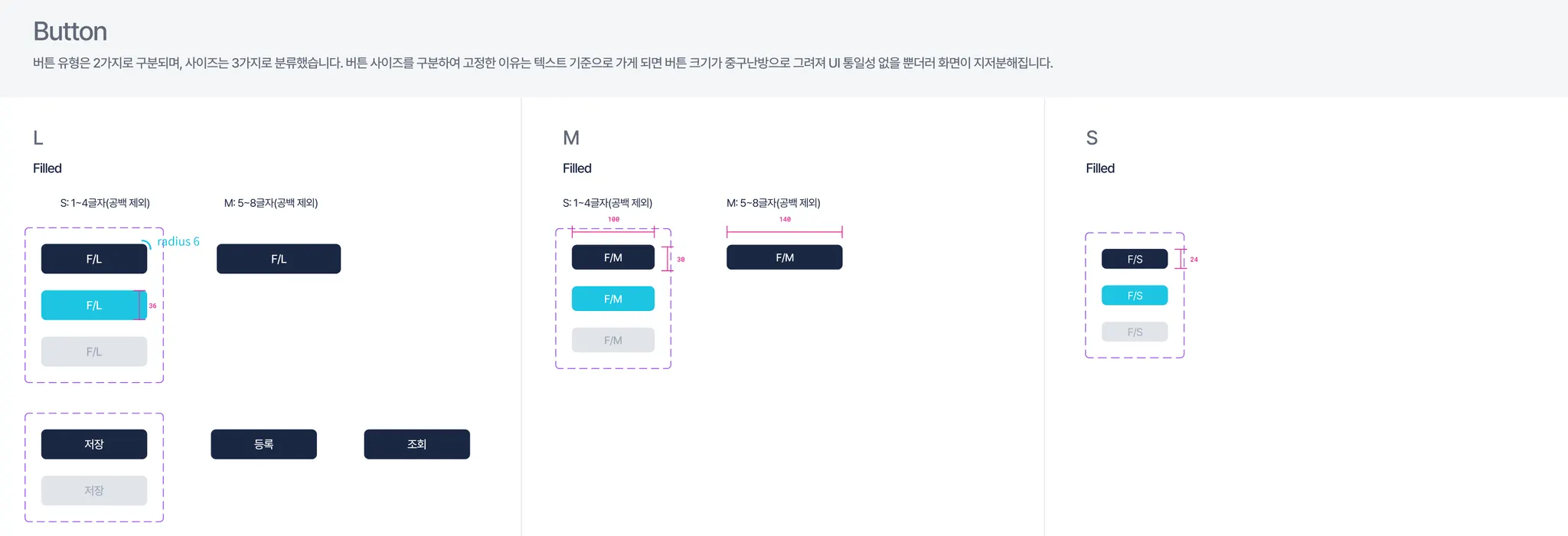 타이포그래피, 컬러 다음으로 가장 중요한 UI 구성요소(컴포넌트)는 어떻게 사용하냐에 따라 사용 범위가 굉장히 넓습니다. 버튼, 체크박스, 라디오 버튼, 툴 팁, 스위치, 스낵바, 얼럿, 컨펌창, 테이블, 리스트 등 플랫폼에서 어떤 상황에 어떻게 쓰일 건지도 상세하게 작성하여 개발자와 소통합니다.