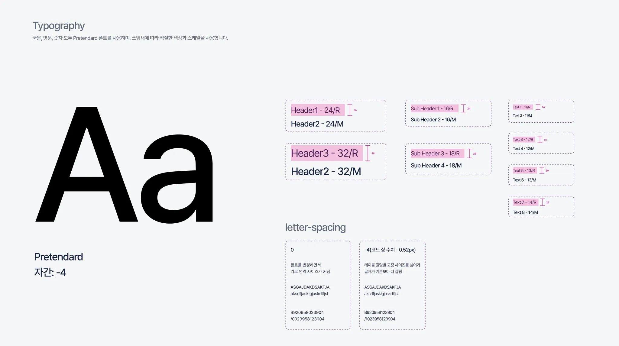 우리가 화면을 볼 때 가장 당연하게 여기며 스쳐 지나갈 수 있는 게 타이포그래피가 아닌가 생각합니다. 단순하게 타이포그래피 종류만 정하면 되지 않을까? 싶지만 어떤 유형에 어떤 사이즈와 두께를 적용할 건지, 이 용어를 어떻게 개발자들과 소통할건지에 대해 작성되어야 합니다. 상세하게 적을수록 오해의 소지가 없어 좋습니다. (조만간 프론트 팀과 타이포 명칭 재정리 할 예정)