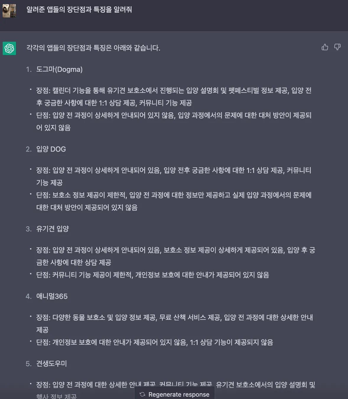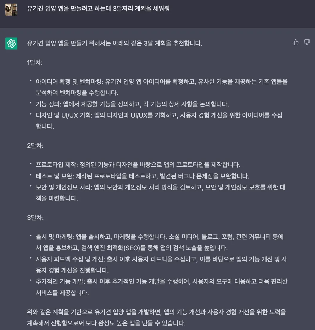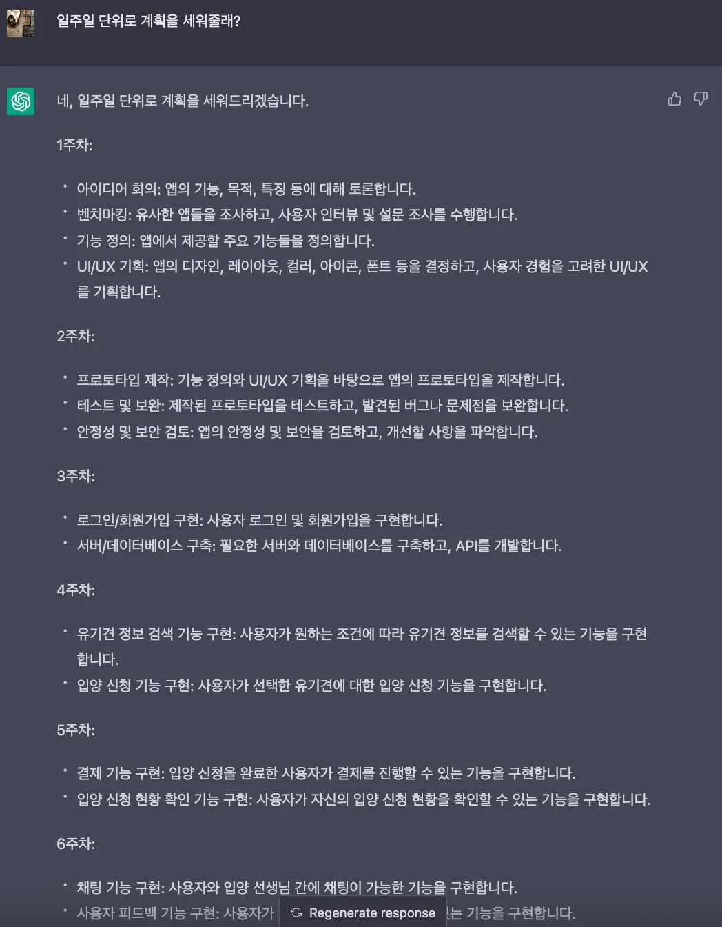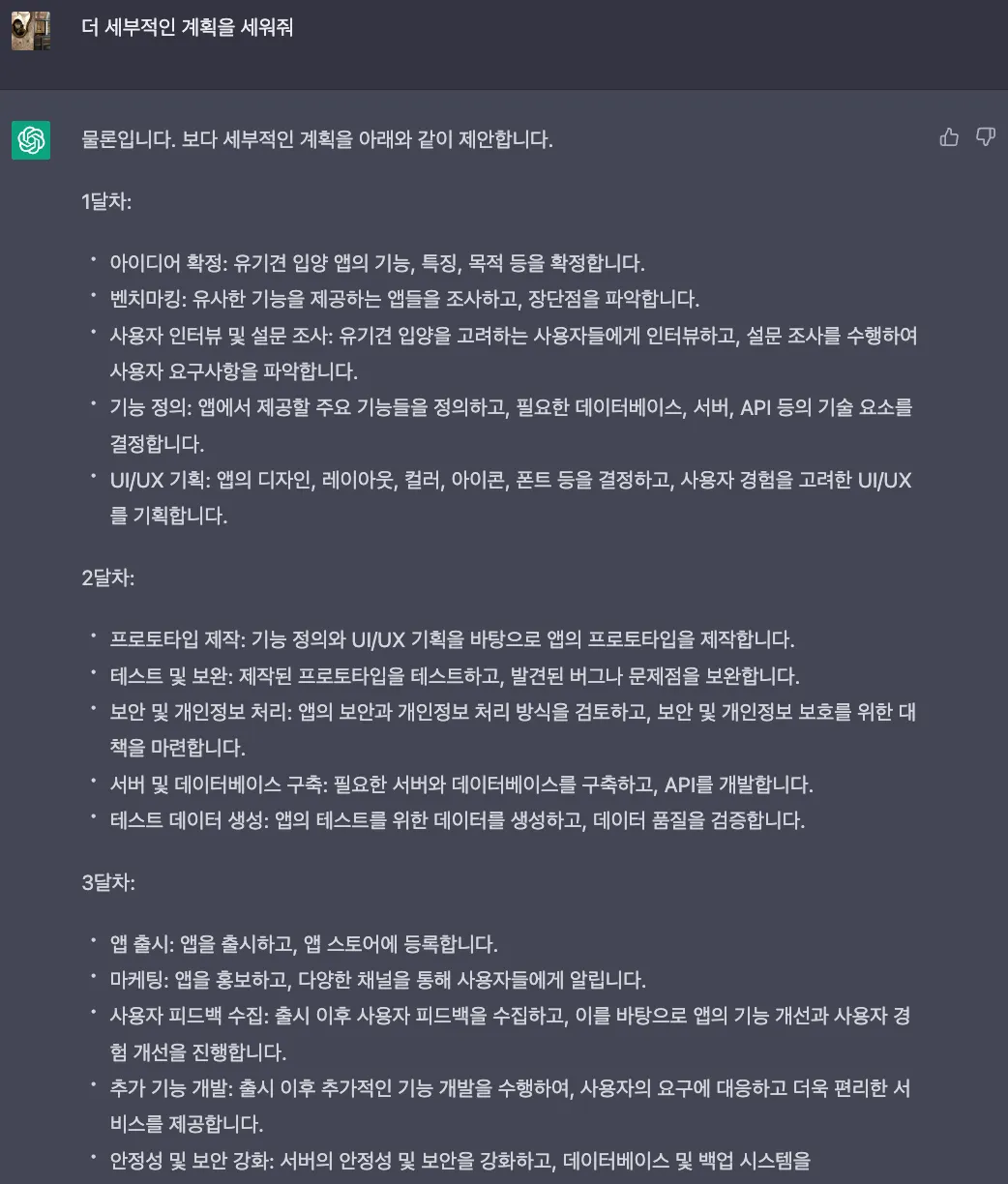 계획을 세워달라고 하는 데에도 꽤 많은 시행착오가 있었다. 앱을 만들고 싶은데 어떻게 진행해야 할까, 앱 기획을 하려고 하는데 개요를 만들어줘, 어플리케이션을 만들려고 하는데 진행 방향에 대해 알려줘 등 조금만 질문이 바뀌어도 원하지 않는 답이 나왔다.