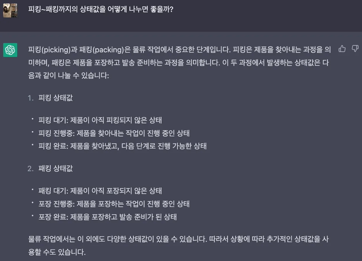 모바일 피킹리스트를 기획하며 피킹과 패킹 상태를 정리하는 과정에서 정보의 홍수 속에 빠지게 되었고, 하나의 답을 얻어보고자 chatGPT에게 물어보게 되었다.